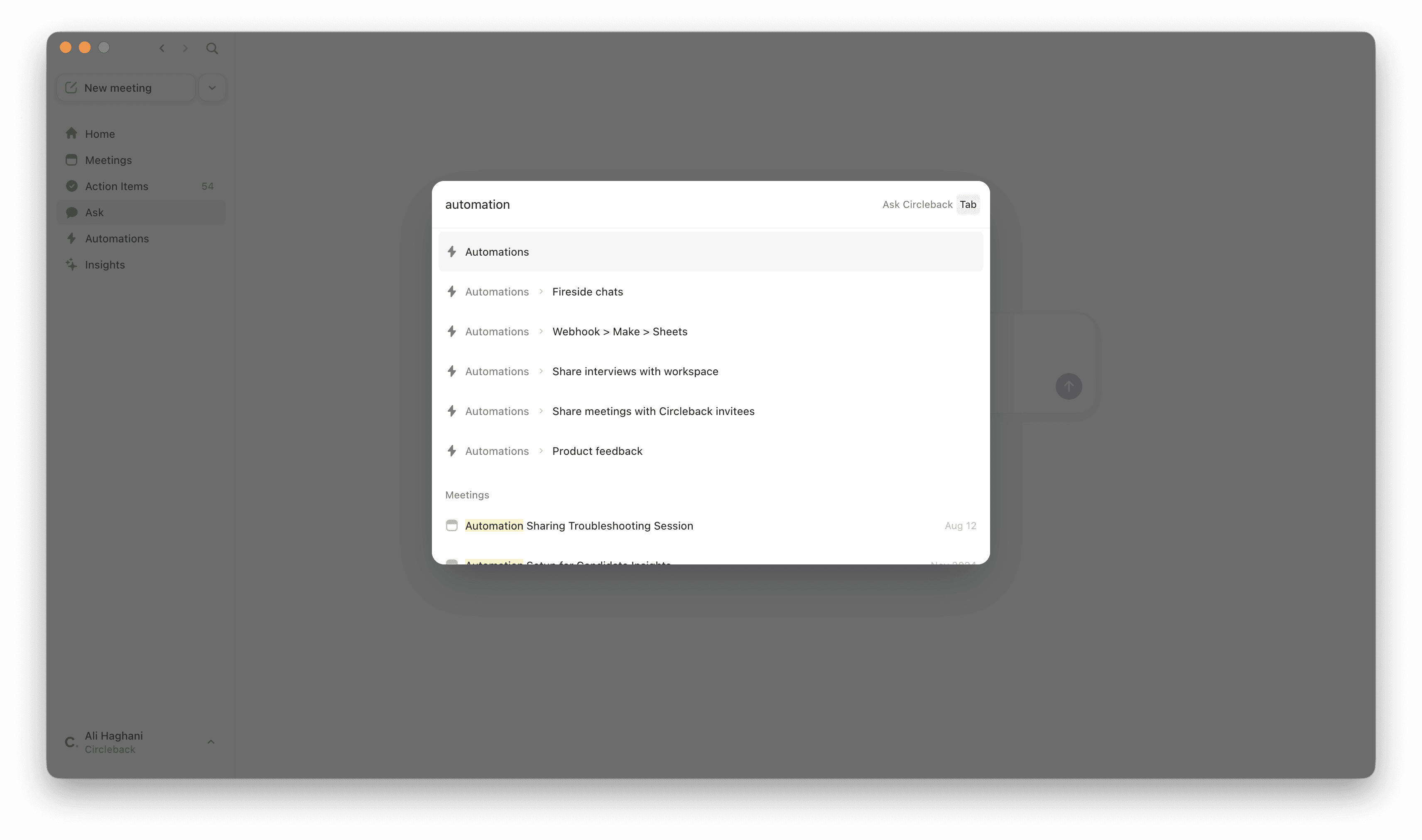 The search modal now doubles as a way to navigate anywhere in Circleback. Press ⌘K (Ctrl K on Windows), /, or tap the search icon to open it, then type where you want to go. Type "calendar," hit enter, and you're in your calendar settings. Type the name of an automation, an insight, or "new meeting" and go straight there. No clicking through menus.