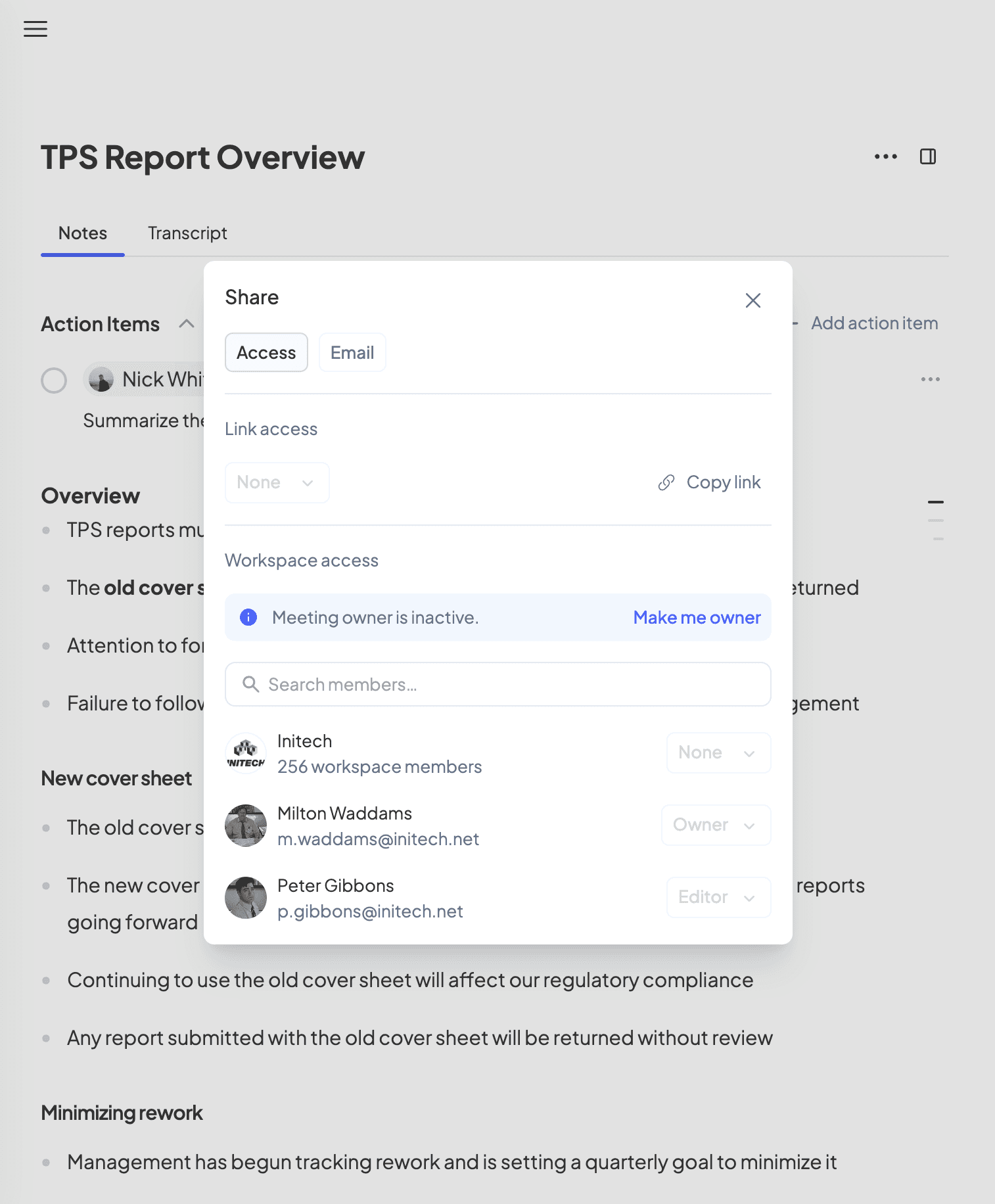 When viewing sharing options for a shared meeting created by an inactive member of your workspace, you'll now see an option to claim ownership of that meeting. Selecting this option will make you an owner of the meeting, allowing you to share, run automations, and delete the meeting.